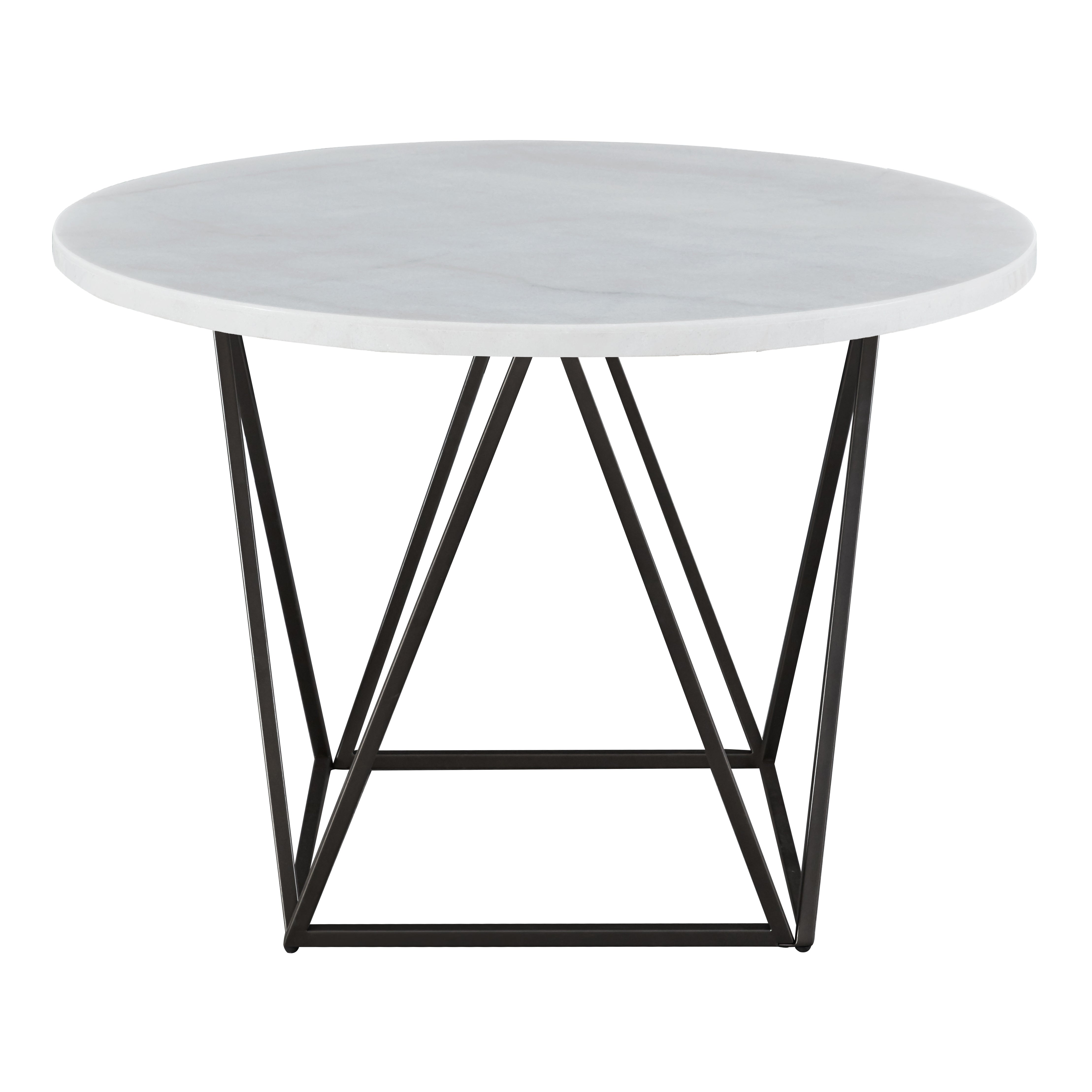 A dining set that is both beautiful and comfortable, Ramona features mid-century modern styling that will instantly update any dining area. This mixed media set features a round white marble top combined with an architecturally shaped dark bronze metal base that is sure to "wow". The ergonomically shaped faux rawhide chair works well as a dining or guest chair with its comfort and clean lines.