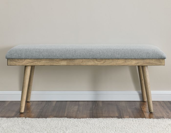 Experience comfort and style with the Vida Dining Bench. Featuring tubular canted solid wood legs and a burnished blonde finish, this bench blends mid-century modern and Scandinavian design, creating a unique and stylish look. Whether for your dining room, entryway, living room or bedroom, this bench offers unparalleled comfort and sophistication.